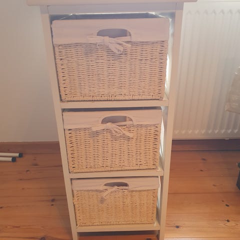 IKEA kommode med fletskuffer i hvid. Møblet har ni kurveskuffer i flet med stofhåndtag, indsat i en hvidmalet træramme. Egnet som opbevaringsmøbel i f.eks. entre, soveværelse eller stue til tøj, tekstiler eller diverse småting. Kurvene kan trækkes helt ud for nem adgang og organisering. Skal afhentes efter aftale.