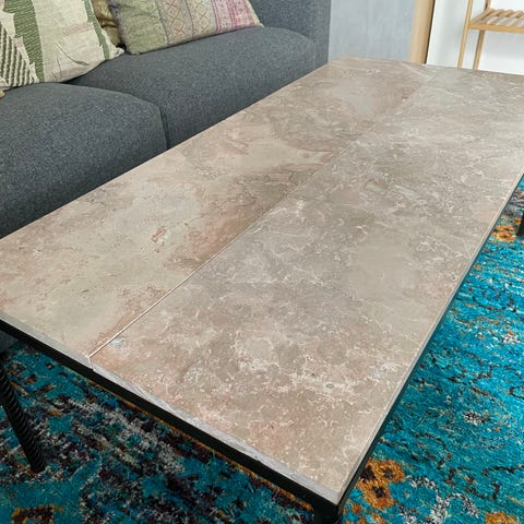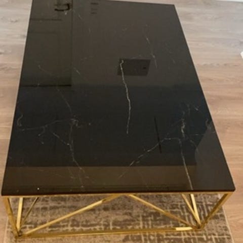 Smukt og moderne Alisma sofabord med grøn marmor-look glasbordplade og elegant guldfarvet metalstel sælges. Original pris: 1100kr.