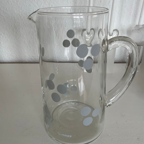 IKEA kande i klart glas. Kanden har hank og hældetud samt markerede ringe på ydersiden. Velegnet til servering af vand, saft eller andre kolde drikke ved bordet eller i køkkenet. Se billeder for mål. Skal afhentes efter aftale.