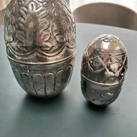 Store påskeæg man kan fylde med det man har lyst til, god gaveide, æggene er i metal og sælges både enkeltvis og samlet, pris pr stk 65