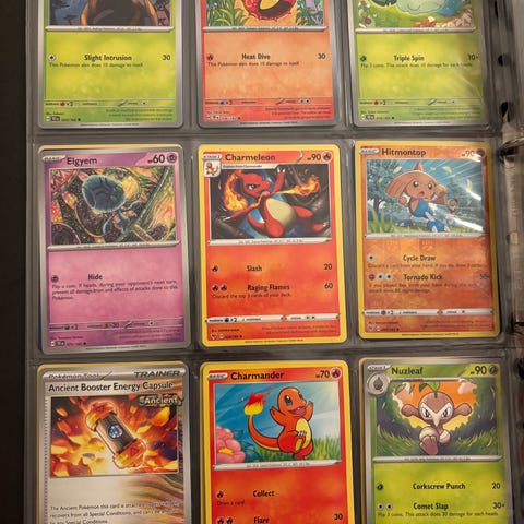 Pokémon samlekort med tilhørende kortalbum. Albummet indeholder plastlommer til opbevaring og organisering af kortene. Kortene omfatter forskellige Pokémon, trænere og energikort fra nyere serier. Velegnet til samlere, bytte eller spil. Antal kort og specifikke serier kan gennemgås ved nærmere inspektion af albummet.