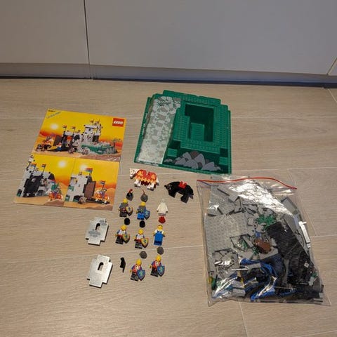 Vintage LEGO Castle lot fra 1980'erne med fem sæt (6080 King's Castle, 6055 Prisoner Convoy, 6034 Black Monarch's Ghost, 6012 Siege Cart, 6011 Black Knight's Treasure) med originale bokse og instruktioner, i brugt stand med minifigurer, heste og belegningsudstyr. Klik på den blå "gå til varen" knap, for at købe eller byde på denne vare. Den samlede pris vil blive vist inden du afgiver dit bud.