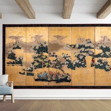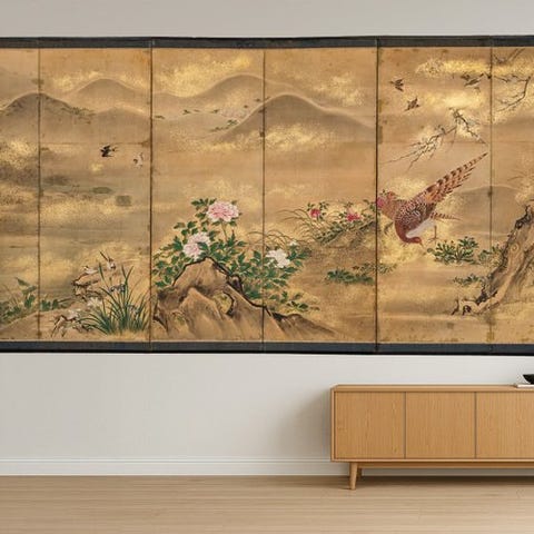 Original Taishō-periode seks-panel Hina’byôbu foldingeskærm fra Japan, malet i farver og blæk på oxideret sølvblad i Kanô-skole-stil, afbildende et japansk bjerglandskab med et biwa-træ, pinie snorret sammen med vinranker, lyserøde krysantemum, duer, spurve og tjeld, indrammet i sortlakkeret træramme; dimensioner 183,6 cm bredde, 60,5 cm højde, 1,2 cm dybde. Klik på den blå "gå til varen" knap, for at købe eller byde på denne vare. Den samlede pris vil blive vist inden du afgiver dit bud.