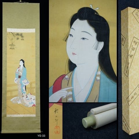 Håndsigneret original japansk hængende scroll fra Taisho-perioden af Ko-u (香雨), bjerglandskab med tempel, 208 cm × 72 cm i silke, i god stand. Klik på den blå "gå til varen" knap, for at købe eller byde på denne vare. Den samlede pris vil blive vist inden du afgiver dit bud.