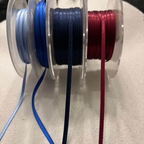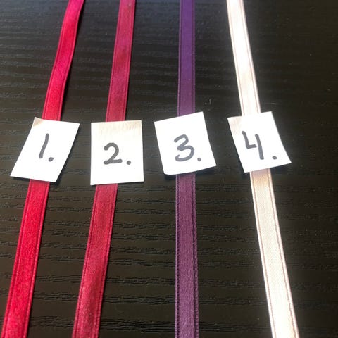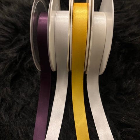 Satin bånd 10 mm i gul, lilla, lyserød, abrikos farver. De sælges samlet. Billeder hvor man kan se bånd ruller, er kun for at danne sig et indtryk over hvor hvor meget der er af bånd, så er ikke de korrekte farver, de ses på billede 1 med numre.