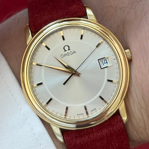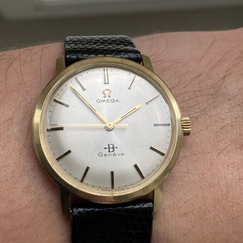 Omega Jumbo i 18k gult guld med manuelopdrag Cal. 265, reference 2619, produceret i 1950 med kasse på 36 mm, champagne-farvet skive med stregindeks og lille sekund ved kl. 6, læderrem, stand meget god med mindre brugsspor. Klik på den blå "gå til varen" knap, for at købe eller byde på denne vare. Den samlede pris vil blive vist inden du afgiver dit bud.