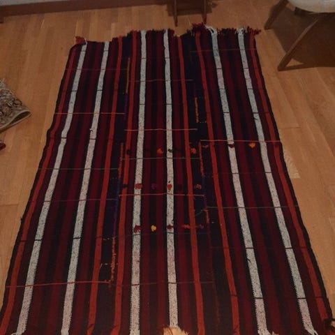 1 håndvævet Bergama Cecim Chuval Kelim fra Tyrkiet (Izmir Bergama), uld på uld, flerfarvet, 92 cm x 54 cm, begyndelsen af det 20. århundrede (omkring 1940), generelt i god stand og professionelt rengjort. Klik på den blå "gå til varen" knap, for at købe eller byde på denne vare. Den samlede pris vil blive vist inden du afgiver dit bud.