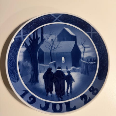 Royal Copenhagen juleplatte i porcelæn fra 1927. Tallerkenen er udført i blå-hvid dekoration med motiv af sømand ved skibets rat og stjerne på himlen samt teksten "Jul 1927" langs kanten. Bagsiden har Royal Copenhagen stempel og modelnummer 189 samt ophængssnor, så tallerkenen kan hænges på væggen. Velegnet som samlerobjekt eller dekoration.