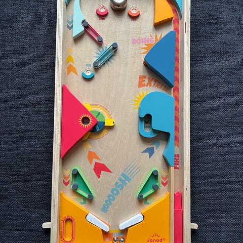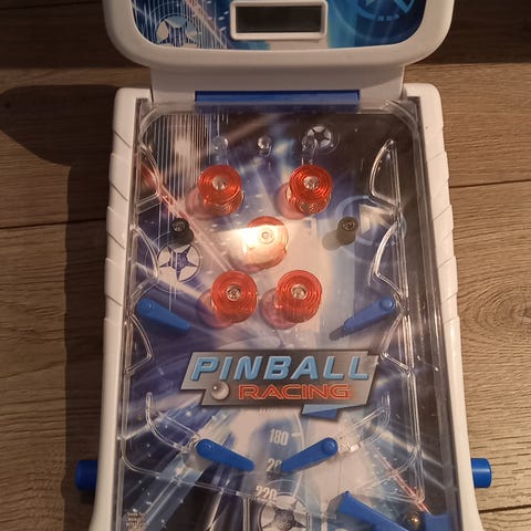 Elektronisk pinball bordspil i plastik i blå, grøn og lilla. Spillet har en farverig spilleplade med rumtema, mekaniske flippere i siderne og et opretstående display øverst med digitalt pointtæller. Spillet er beregnet som bordmodel og kan foldes delvist sammen, så det fylder mindre ved opbevaring. Egnet som legetøj til børn, der kan lide pinball- og arkadespil.