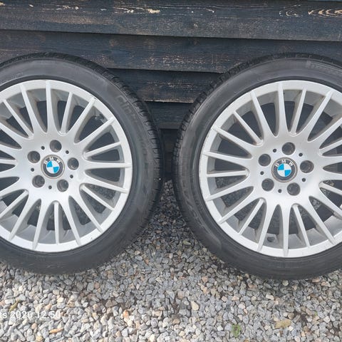 Fire styks af den klassiske M-sport fælg inkl Continental dæk med ok slidbane. Bemærk at hjulene er lavet til et staggered set up med bredere dæk bagerst. Målene hedder 245/40 - 17 bag og 225/45 - 17 for. Fælgene er ok, men har en del ridser langs kanten. En gang slib og lak, så er de perfekte igen.