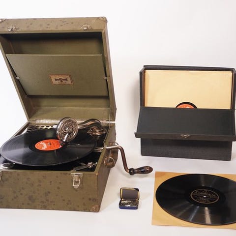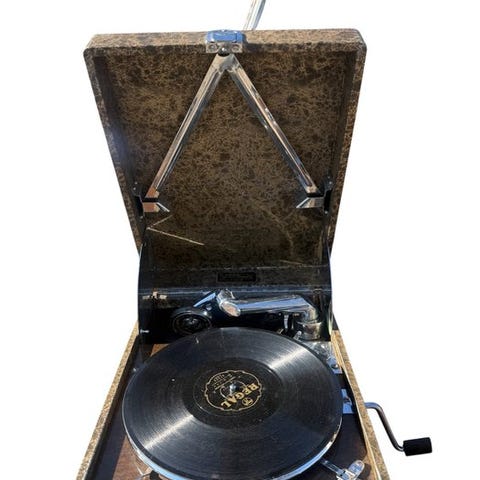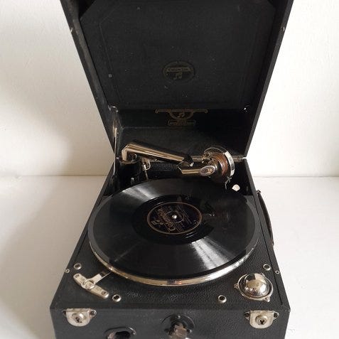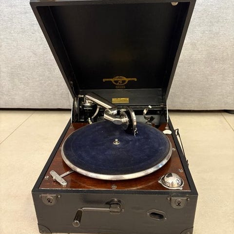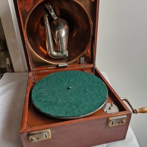 Antikke bærbare gramofon Decca Trench-model fra 1920’erne. Disse gramofoner var kendt for deres bærbarhed og blev sjældent brugt under Første Verdenskrig. Decca var en stor britisk producent. Messing klankskål er typisk. Fjederen er let at optrække og har lang spilletid. Nålen reagerer godt på berøring. Kassen (udvendigt) viser brugsspor, hvilket ikke er overraskende naturligvis i betragtning af alderen.