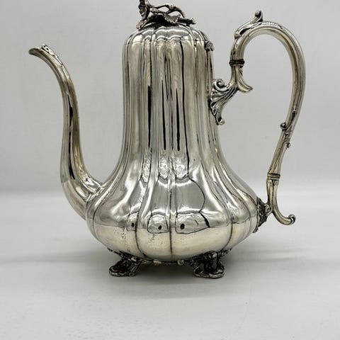 Et imponerende og komplet antik engelsk tesæt, der består af seks koordinerede dele med elegante hævede blomsterdekorationer og udslebne fødder. Alle genstande er i fremragende stand uden reparationer.