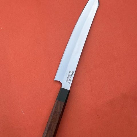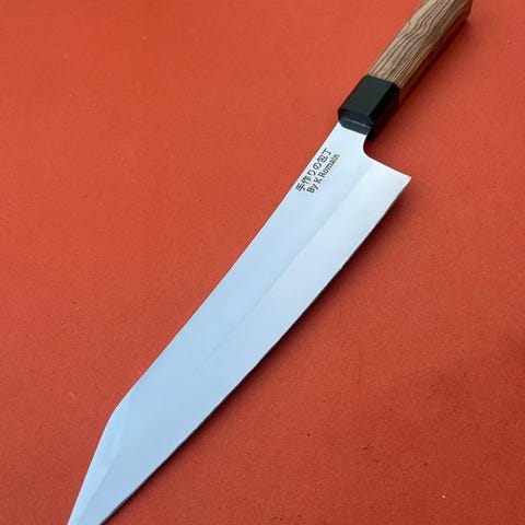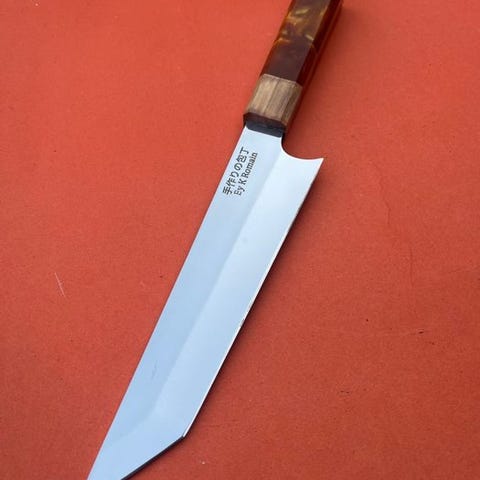 K Romain Gyuto, udformet i samarbejde med japanske håndværkere, indkapsler den perfekte fusion af form og funktion. Smiddet af førsteklasses japansk stål har denne kokkekniv et afbalanceret blad på 8 tommer med en barberknivskarpt kant, ideelt til skiver, hakning og præcisionssnit. De håndsmedede hamon og de subtile graveringer vidner om japansk håndværkskunst. Den ergonomiske, håndsyede træhåndtag giver fremragende komfort og kontrol. Et mesterværktøj for kulinariske professionelle og entusiaster, denne Gyuto er et vidnesbyrd om fusionen af fransk innovation og japansk tradition.