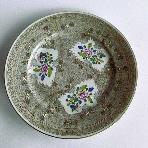 Tallerkenerne præsenterer en elegant grøn blomsterdekoration malet i hånden, med en delikat central buket ledsaget af små blomstermotiver fordelt langs kanten. Falde n er beriget af et karakteristisk sammenflettet relief-type “kurvevævet” mønster, et dekorativt element typisk for manufakturen, som skaber en raffineret lyslegering på den glasurerede overflade.