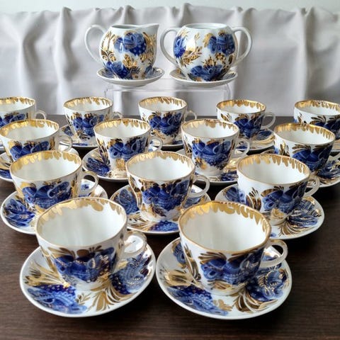 Designer: A.YatskevichShape: TulipShape designer: S.YakovlevaEt vidunderligt lyst "Cobalt Net" te-sæt til 3 personer, fremstillet ved Lomonosov Imperial Porcelain Factory (ЛФЗ). Smukt håndmalet design beriget med 22 karat guldkant under glasur. 4 kopper (250 ml) 4 tallerkener 15 cm og 4 kageplader 15,5 cm