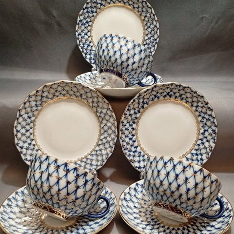 Berømt cobalt net-design af kunstneren Anna Yatskevich. Håndmalet med 22 karat guld.