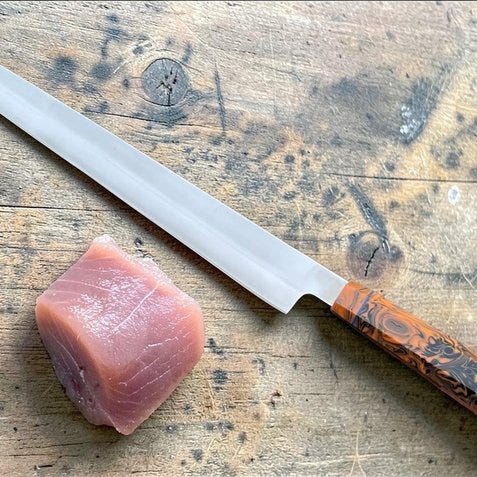 Håndtaget fremviser et markant rødt og sort marmoreret design, skabt til både visuel appel og ergonomisk komfort. Fastgjort med polerede messingnåle tilbyder håndtaget et solidt, afbalanceret greb der reducerer træthed i hånden ved længere brug. Med en kombination af funktionalitet og markant stil er kniven en pålidelig og iøjnefaldende tilføjelse til ethvert