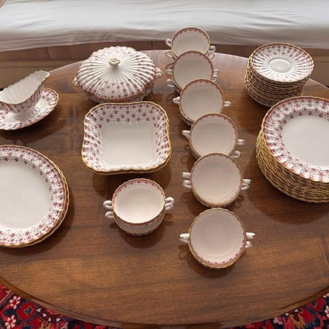 24 små tallerkener, 24 suppeskåle, 24 flade tallerkener, 8 anretnings-tallerkener i forskellige størrelser, 2 suppeskåle med låg, 12 thekopper, 12 små tallerkener, 1 tekande med låg, 1 mælkekande, 1 sukkerskål med låg, 12 kaffekopper, 12 små tallerkener, 1 sukkerskål med låg, 1 kaffekande, 1 mælkekande