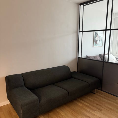 Sofaen er gråmeleret, med stålben og er ca. 15 år gammel. Den har brugsspor i form af enkelte pletter og stoffet nedenunder er blevet revet i stykker og syet igen (ses dog ikke, medmindre man kigger under sofaen). Sofaen er blevet lidt “træt” i skummet. Kommer fra dyre- og røgfrit hjem. Der medfølger puf. Kan afhentes gratis.
