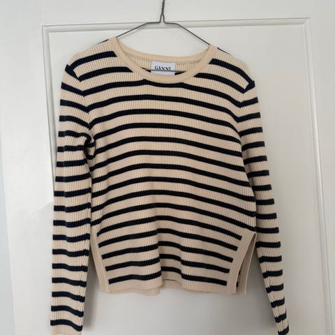 Ganni sweater til kvinder i uld i farven beige, størrelse one size. Strikken er håndstrikket med høj hals og blomstermønster på både for- og bagside - som er åben. Egnet som varm trøje til hverdagsbrug i køligere vejr. En meget smuk og særlig trøje.