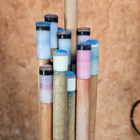 Billardkø i træ med sort og grøn dekoration på den nederste del og naturfarvet træ på den øverste del. Velegnet til brug ved almindeligt billard- eller poolspil. Køen fremstår som en klassisk, lige model med standard længde og glat overflade for et stabilt greb.