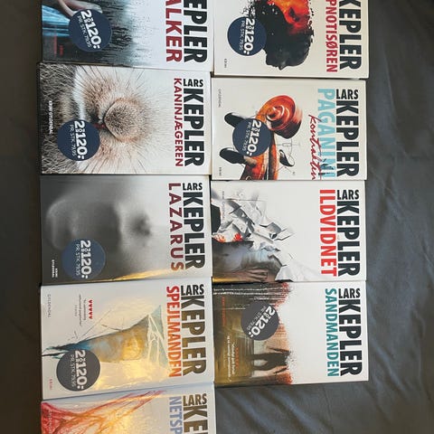 Lars Kepler krimiserie bogsæt med 6 bind. Sættet omfatter titlerne: "Hypnotisøren", "Paganini-kontrakten", "Ildvidnet", "Sandmanden", "Stalker" og "Kaninjægeren". Bøgerne er i hardback-udgave og tilhører krimigenren.