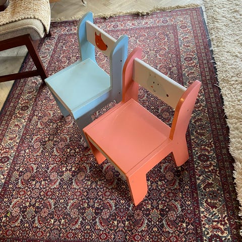 børnestol i træ med sæde og ryglæn i pastelfarver, én i grønne nuancer og én i gule nuancer. Stolen har ovalt hul i ryglænet og er i børnestørrelse, egnet til brug ved børnebord eller som ekstra siddeplads på børneværelset. Træben og en model med hvidmalede ben giver et enkelt og funktionelt udtryk, der passer til de fleste børneværelser og legeområder