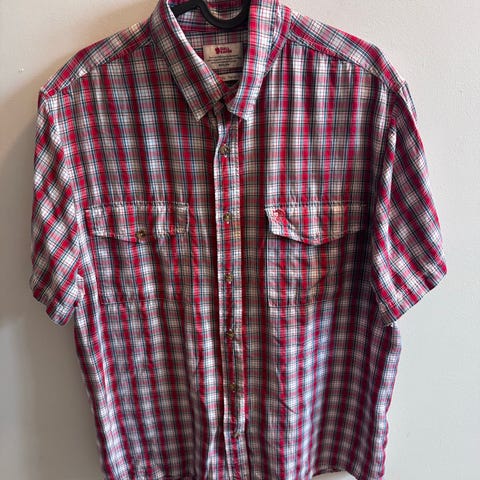 Fjällräven Singi Flannel Shirt langærmet herreskjorte i størrelse XXL. Skjorten er i ternet mønster med nuancer af mørkeblå, hvid og rød. Materialet består af 91 % bomuld og 9 % uld, hvilket giver en blød flannelkvalitet. Modellen er angivet som Comfort Fit og har knaplukning foran samt brystlommer med klap. Skjorten har klassisk krave og Fjällräven-logo på ærmet. Velegnet som hverdags- eller friluftsskjorte i køligere vejr.