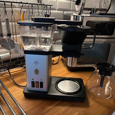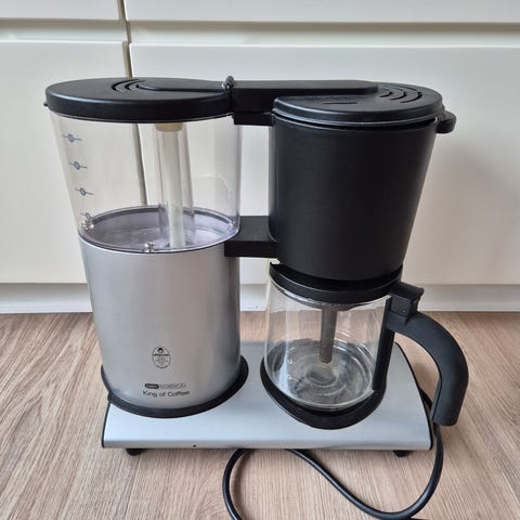 OBH Nordica kaffemaskine i rød med sort top og glas-kande. Maskinen har separat vandbeholder og kande placeret på opvarmningsplade. Strømtilslutning via ledning medfølger som en integreret del af apparatet. Velegnet til brygning af filterkaffe i hjemmet eller på kontoret.