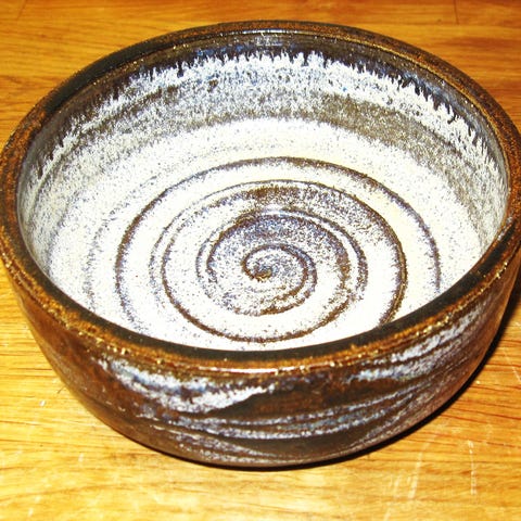 Michael Andersen stentøjsskål med fugle af Marianne Starck. Keramisk skål med dekoreret yderside med fuglemotiv i brune nuancer. Indersiden har en lys, drejet spiralstruktur, og kanten er mørkglaseret. Skålen står på en glaseret bund med markeringer. Velegnet som dekorationsskål eller til opbevaring på bord eller reol.
