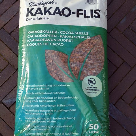 Omkring 12 papirssække fyldt med kakaobønneskaller sælges. De har været lagt ud, men nu fjernet og puttet i sække. Oprindeligt 1 CuM. Bruges som bunddække i stedet for træflis / barkflis / flis