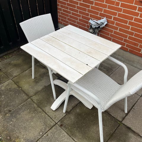 Bord og stole er i fin stand. Ingen skader udover nogle få slagmærker på siden af bordpladen.