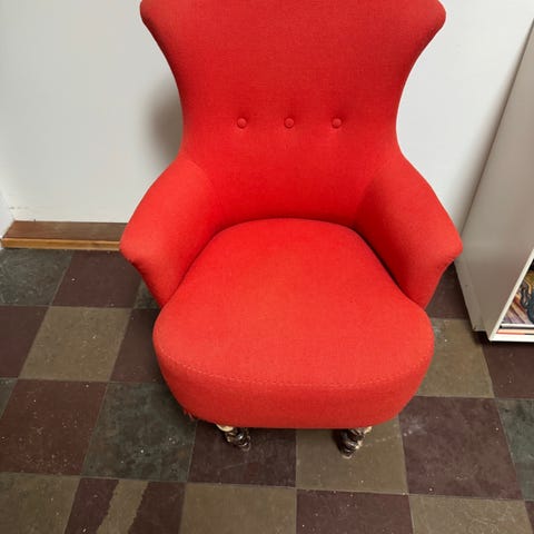 Klassisk og hyggelig lænestol i rød stof. Pæn brugt stand med let falmning på top af ryg og armlæn. Røgfrit hjem, ingen husdyr.