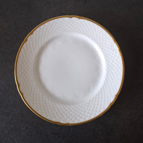 Porcelæn, Dyb tallerken, Bing og Grøndal Hostrup, Dyb tallerken med en bred guldkant. Diameter 21 cm. Produceret 1952-1957. 4 stk.