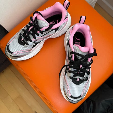 Puma sneakers til kvinder i beige med blå detaljer. Overdel i tekstil og ruskind med præget mønster. Store satinbånd fungerer som snørebånd. Ydersål i hvid gummi med mønstret sål for greb. Velegnet som hverdagssko. Størrelse svarer cirka til dame str. 38 måler 24 cm.