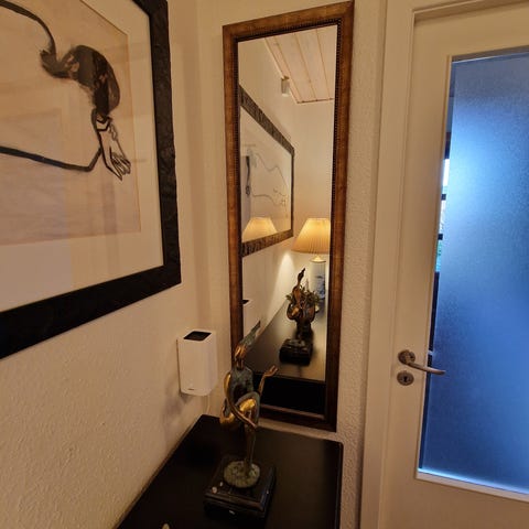 Spejlet har en mindre skade/nedslag i det ene nederste hjørne, som ses på billedet.