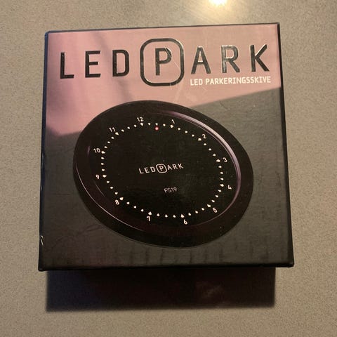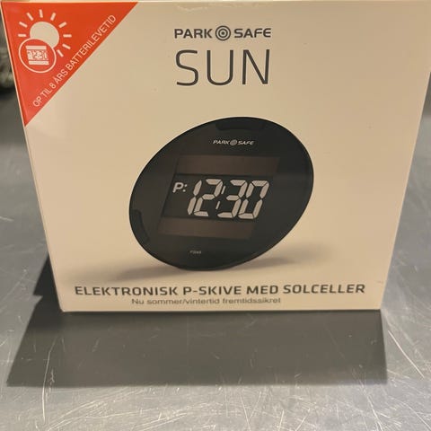 ParkSafe FS24 elektronisk p-skive med digitalt display. Rund model til montering i bilens forrude. Viser parkeringsstarttidspunkt elektronisk på skærmen. Drevet af batteri (ikke synligt på billedet).