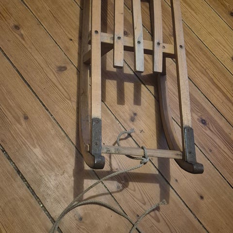 Træ kælk med lameller. Klassisk model i lyst træ med flere parallelle lameller og buede meder. Velegnet som brugsgenstand om vinteren eller som dekorativt element, f.eks. til udsmykning eller rekvisitter. Mål og yderligere detaljer kan måles efter behov på baggrund af de viste billeder med målebånd.