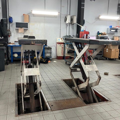Hydraulisk sakselift . Løftebukken består af en blå ramme med integreret hydraulikpumpe og styreboks samt en separat orange løfteenhed med hydraulikcylinder. Enheden er beregnet til løft af køretøjer ved service- og reparationsarbejde i garage eller værksted. Tilslutning sker via kraftstik, og liften anvender hydraulisk olie til drift. Egnet til montering nedfældet i gulv eller som lavprofil-lift afhængigt af installation.