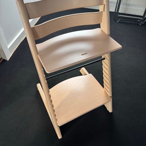 Stokke Tripp Trapp højstol i hvid. Klassisk træhøjstol med justerbar siddeplade og fodplade, der kan tilpasses barnets højde. Leveres med bøjle/sele foran til mindre børn. Velegnet som spisebordsstol til børn og kan bruges over længere tid efterhånden som barnet vokser.