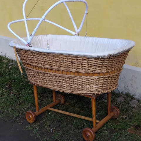 Gammel kurveflet barnevogn med original madras. Selve kurven måler ca. 60/90 og den samlede højde er ca. 90 cm. Perfekt til altan eller bare til pynt.