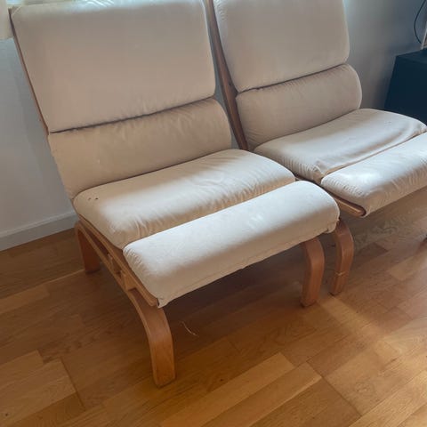 Sælger 2 flotte og klassiske lænestole fra Daniture, designet af Arch. Bernt. Stolene er produceret i Danmark og har et tidløst, minimalistisk look med bøgetræsramme og lyse hynder.