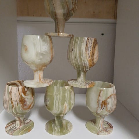 Onyx vinglas sæt i sten med naturlige åretegninger i forskellige brune, gule og grønne nuancer. Glassene er drejet i massiv onyx og har fod, så de kan bruges som små vinglas, likørglas eller dekorative pyntegenstande. Velegnet til borddækning eller som udsmykning i hjemmet.