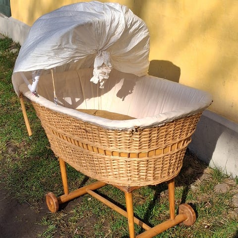 Gammel kurveflet vugge/barnevogn med original madres. Selve kurven måler ca. 90/60 cm. Højden ca. 60 cm.