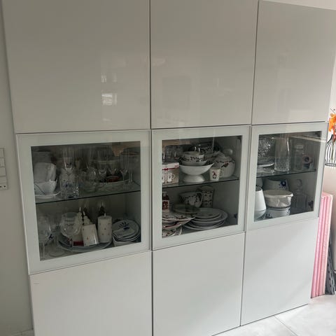 Vi har i alt to enheder, som tilsammen består af seks skabe med låger og flere hylder.