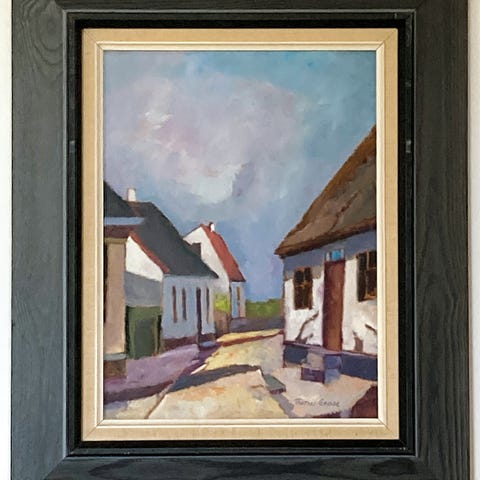 Kompositionen er enkel, men effektiv – med marker, bygninger og lodrette elementer, der skaber balance og dybde. Farvepaletten er varm og afdæmpet med jordtoner og bløde overgange, hvilket gør værket meget anvendeligt i moderne indretning.