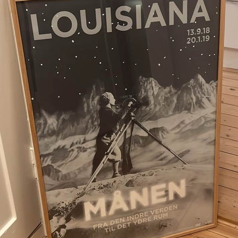 Louisiana Arne Jacobsen udstillingsplakat. Motivet er Arne Jacobsens “fremtidens hus”. Velegnet som vægdekoration i stue, kontor eller gang. Plakaten er monteret bag glas i en tynd, sort træramme, klar til ophængning.