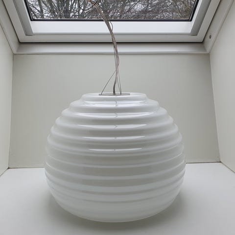 Samhørende Italiensk glas væglampe og glas loftslampe, begge med aubergine farvet yder glas. Klar glas i bund og matteret glas i top. Velegnet som belysning i fx stue, soveværelse eller gang, hvor der ønskes væg- og loftsmonteret lys.