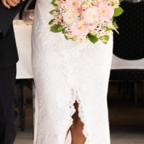 Kjolen er kun prøvet på en gang og var meningen den skulle bruges som brudekjole, kjolens størelse svare til en XS/S.