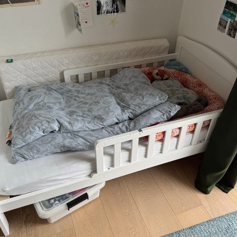 Jollyroom juniorseng. Juniorsengen er egnet til mindre børn, som er vokset ud af tremmesengen, men endnu ikke skal over i en almindelig seng. Sengen passer ind på børneværelset og kan kombineres med sengehimmel eller andet tilbehør efter behov.